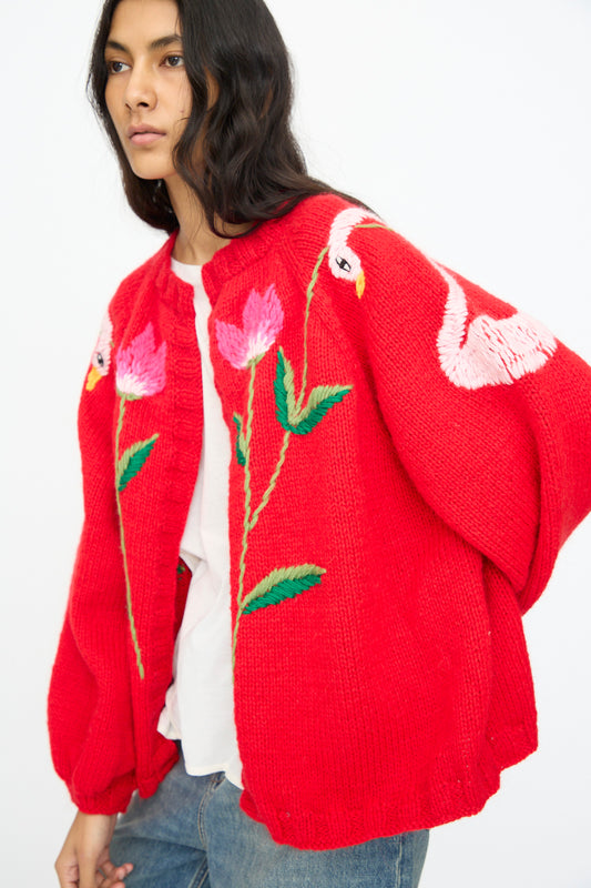 Cardigan in Red with Flowers and Swans