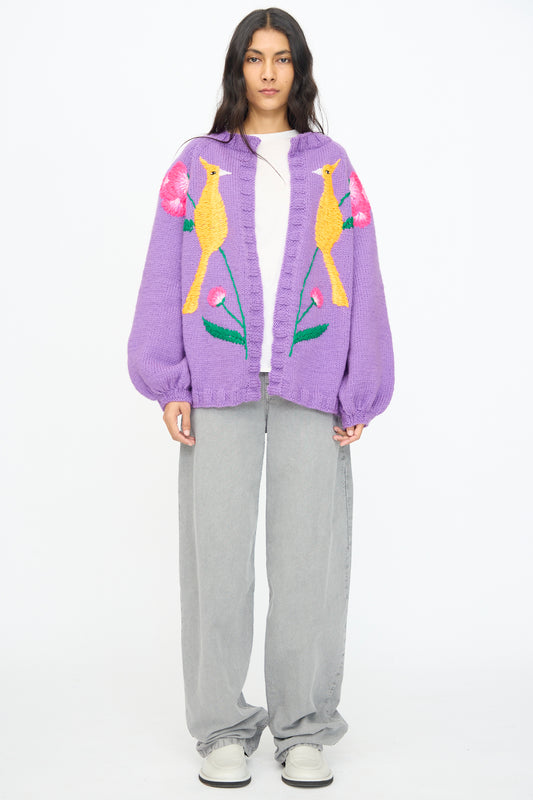 Cardigan in Purple with Bird and Flower