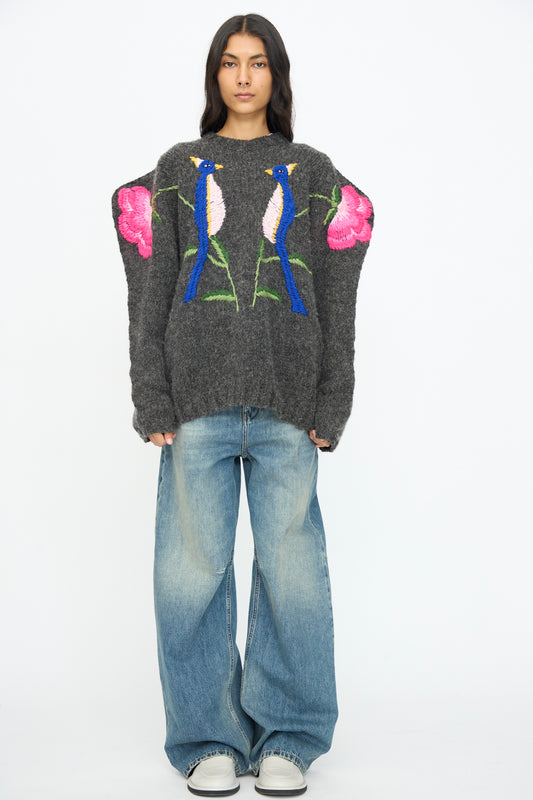 Sweater in Charcoal with Birds and Flowers