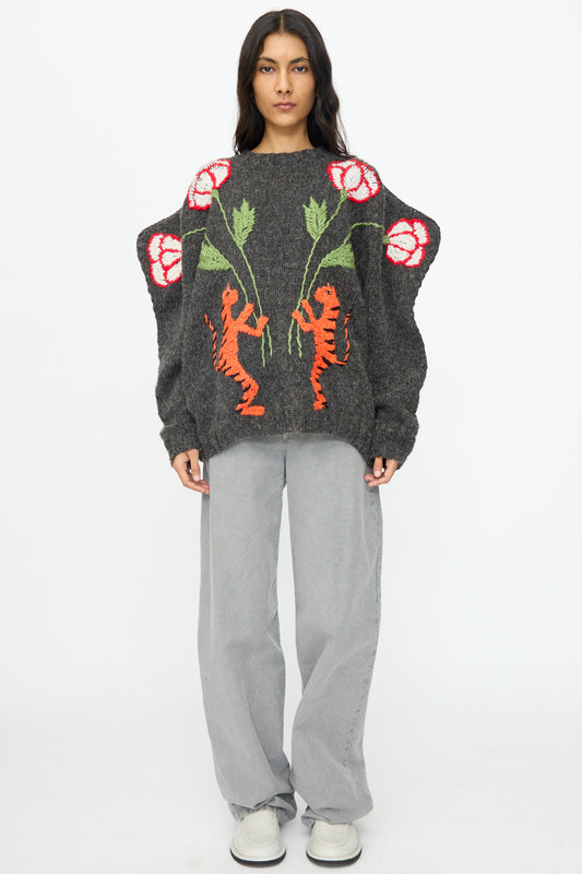 Sweater in Charcoal with Tigers and Flowers